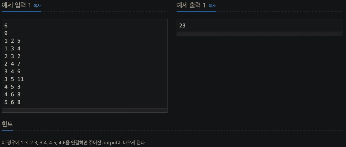 1922번: 네트워크 연결이 경우에 1-3, 2-3, 3-4, 4-5, 4-6을 연결하면 주어진 output이 나오게 된다.www.acmicpc.net