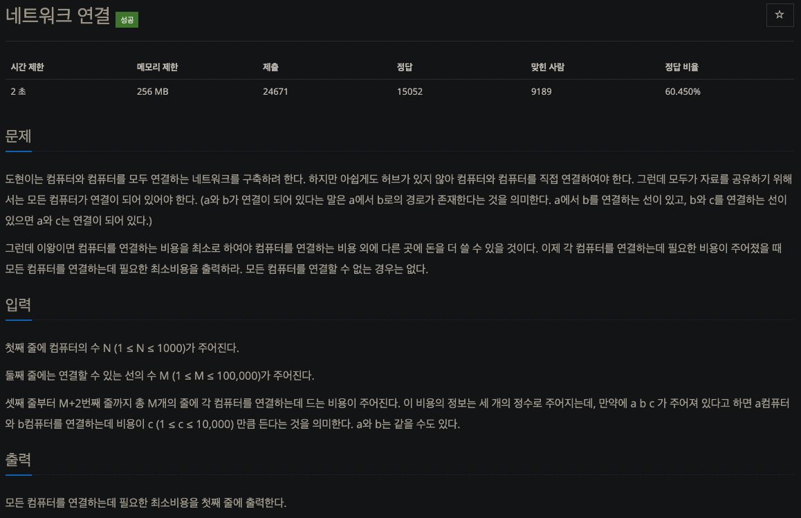 백준 1922번 문제입니다. (solved.ac)기준 골드 4 문제입니다.