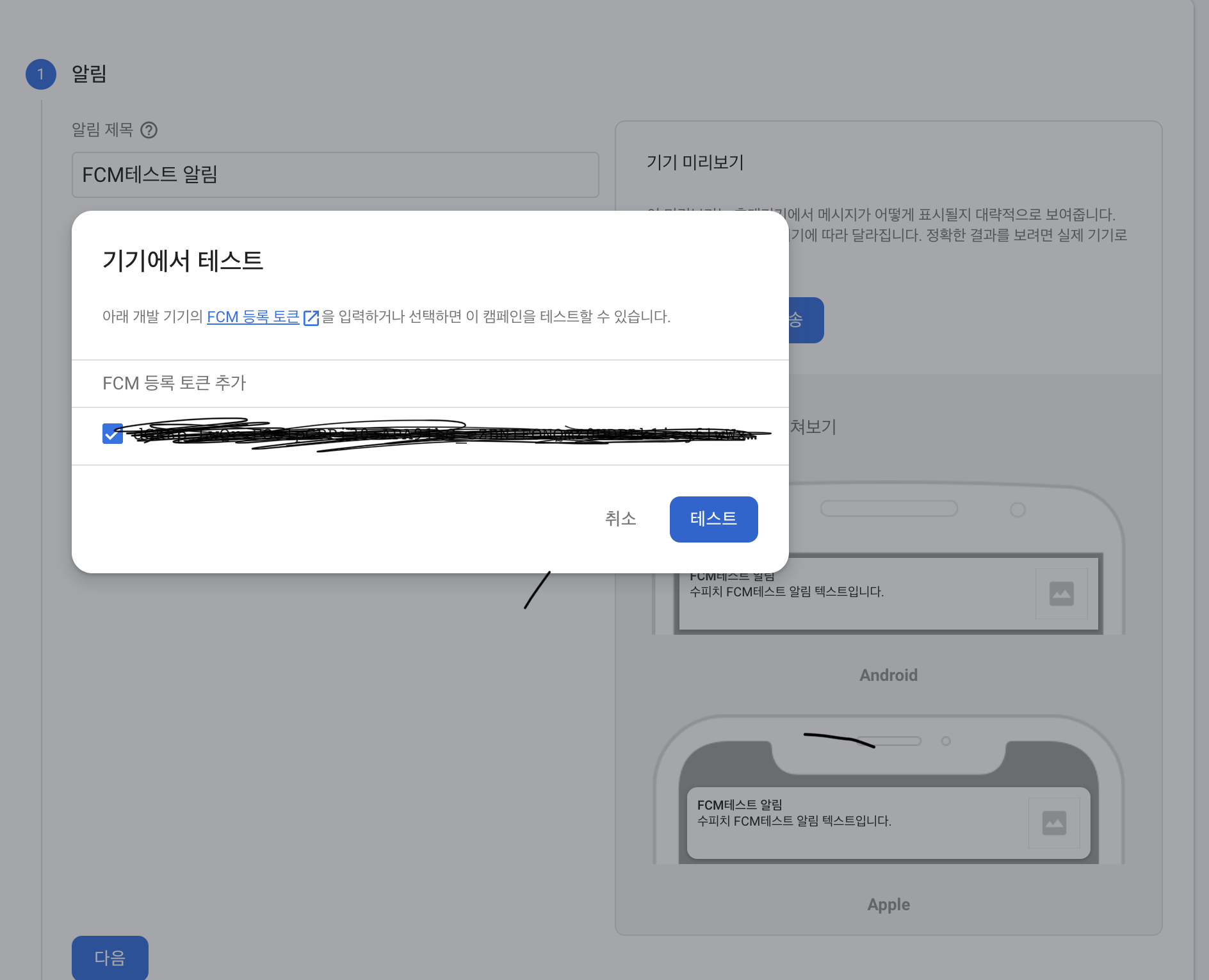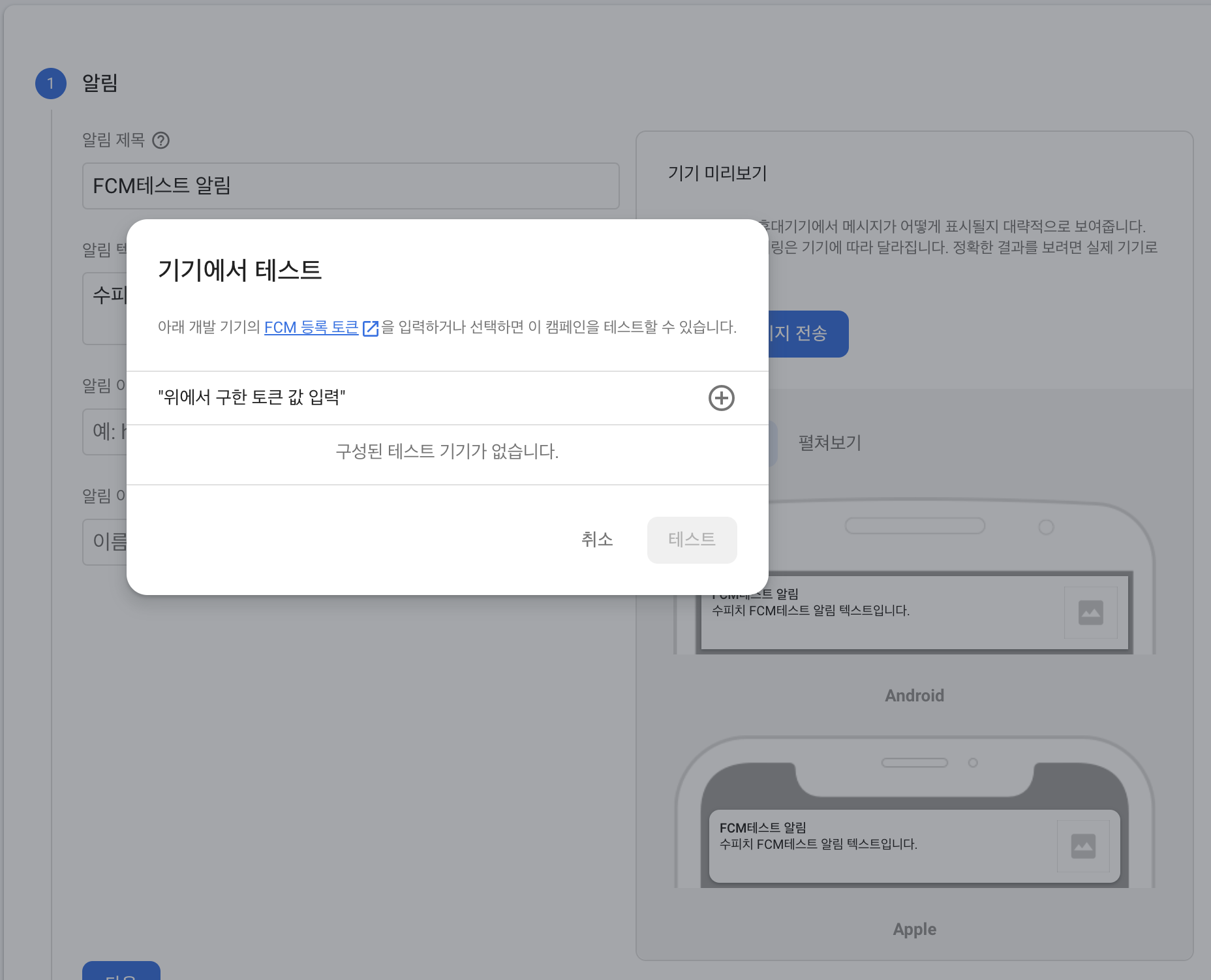 마지막으로 "위에서 구한 토큰 값 입력" 에 아까 구한 토큰 값을 넣고 오른쪽에 +버튼을 눌러 테스트 기기의 토큰값을 추가해줍니다.