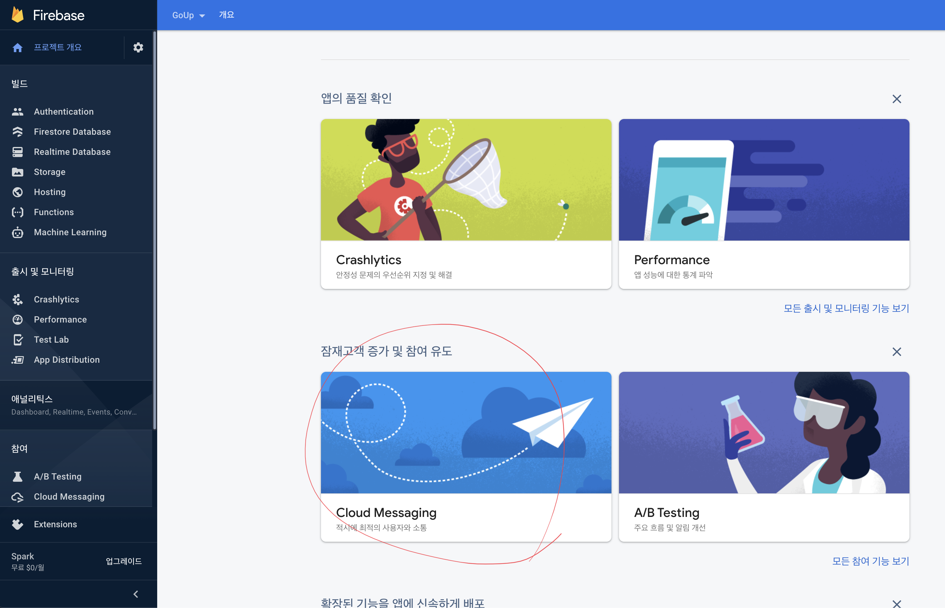위의 토큰값을 가지고 있는 기기에 알림을 보내기 위하여 파이어베이스 콘솔에있는 [Cloud Messaging]을 이용하겠습니다.