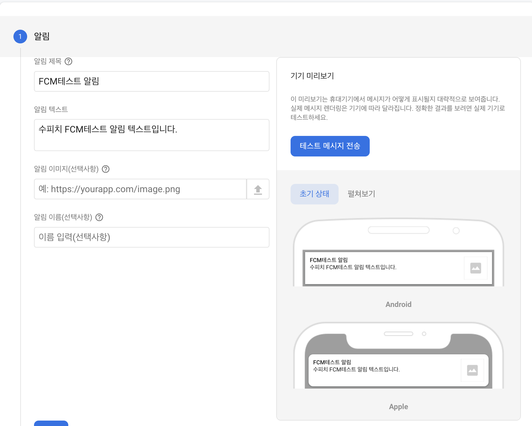 우선 테스트용으로 필수항목인 알림 제목과 알림 텍스트만 입력해주었습니다. 알림 내용을 입력해주면 우측하단에서 미리보기로 어떻게 알림이 사용자에게 보여지게 되는지 확인할 수 있습니다.