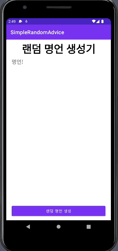 간단하게 랜덤 명언 생성 버튼을 누르면 명언! 부분에 랜덤한 명언이 들어갈 수 있도록 만들어주었습니다.